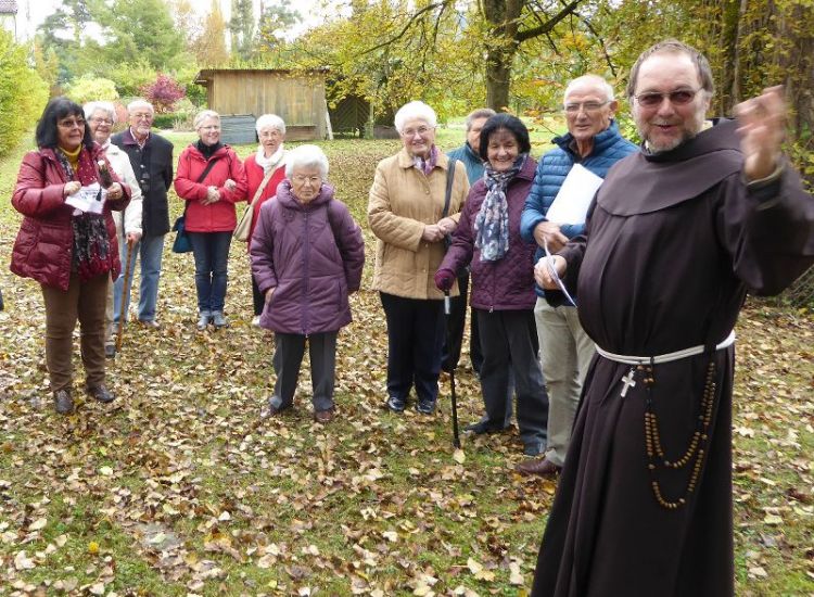 Im Privatgarten des Klosters berichtet Bruder Klaus (rechts) viel über die Geschichte der Insel. Bild : Soziales Netzwerk Aach